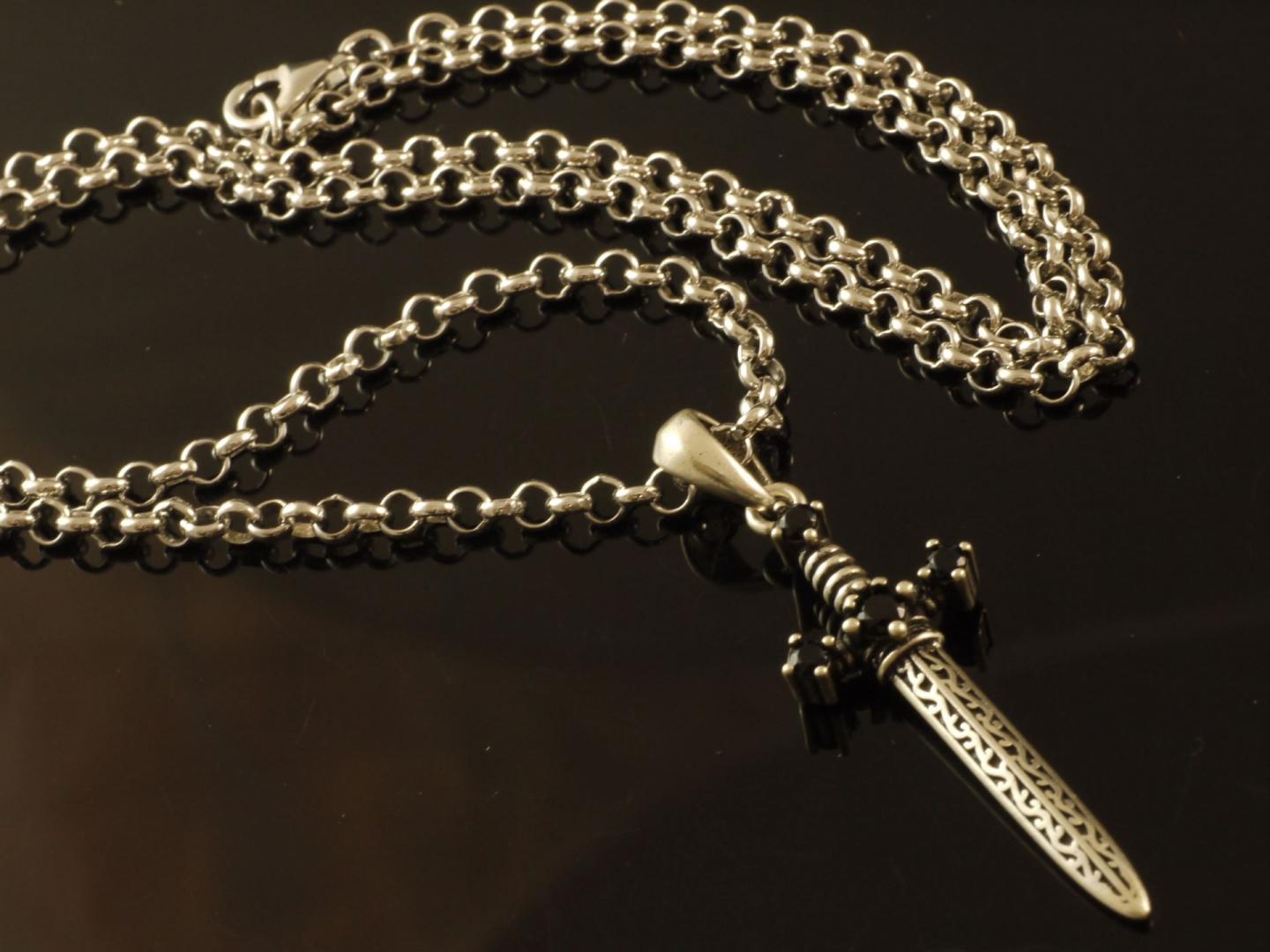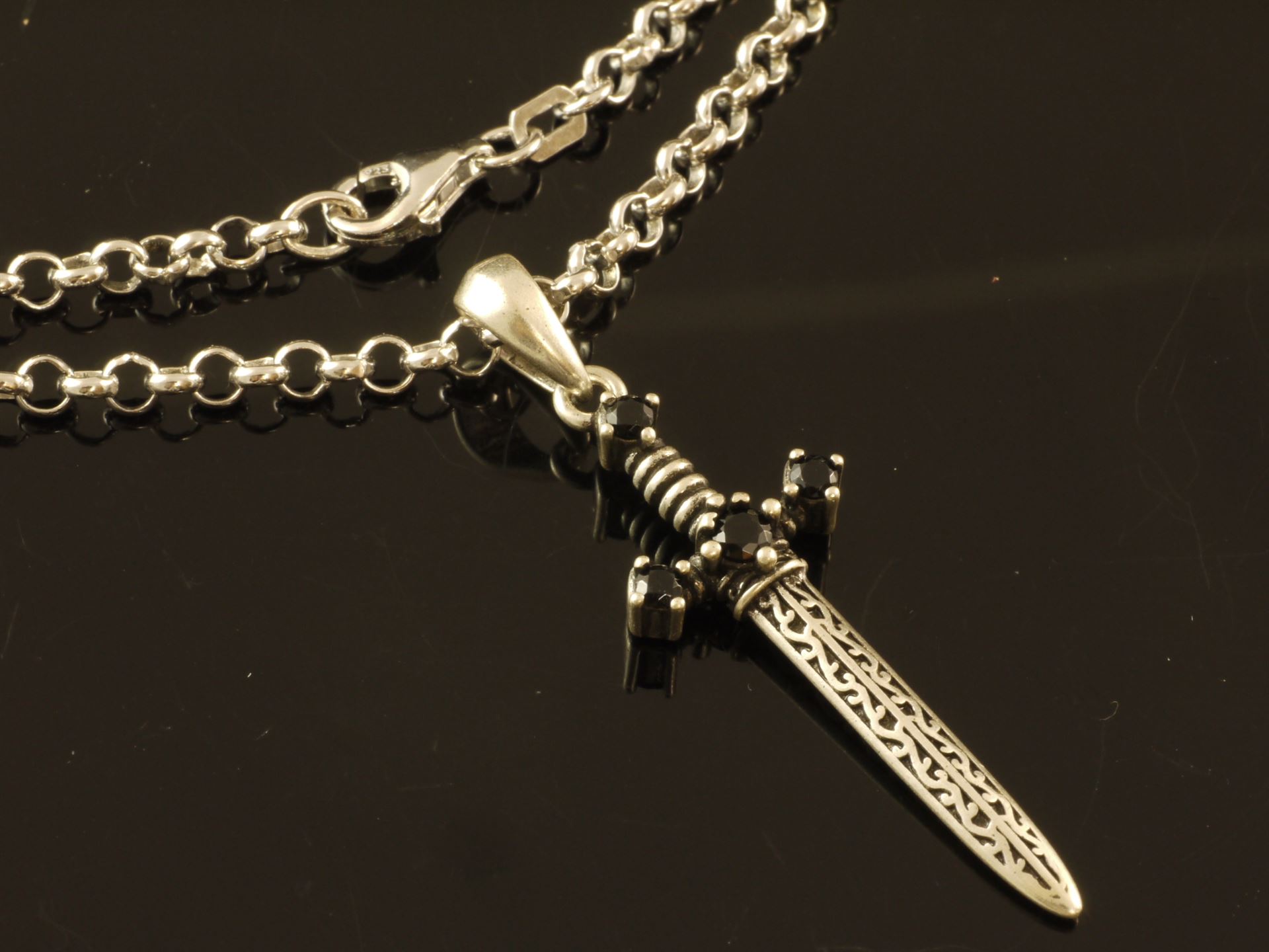 925 Silberkette mit Schwert Anhänger mit schwarzen Zirkonia Steinen